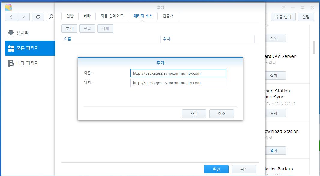 패키지센터-설정-패키지 소스-추가