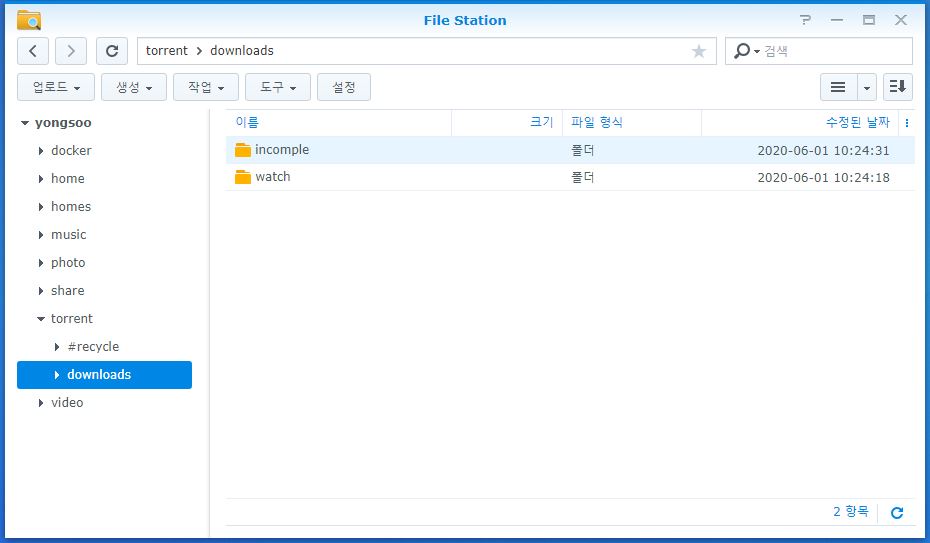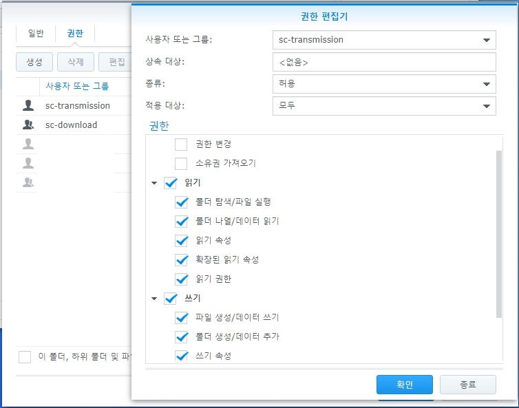 -File Station-자신이 설정한 다운로드 폴더 우클릭-속성-권한- 생성