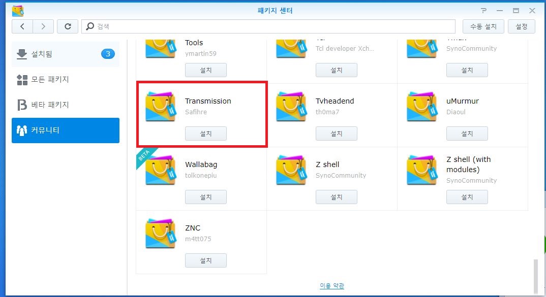 위에 처럼 설치가 완료가 되면 아래처럼 커뮤니티 가 생성되고 내리다 보면 Transmission이라는 프로그램이 보이게 됩니다. 이를 설치하면 되는데요 설치시 권한문제 때문인지 안되더라구요 반드시 권한을 부여하거나