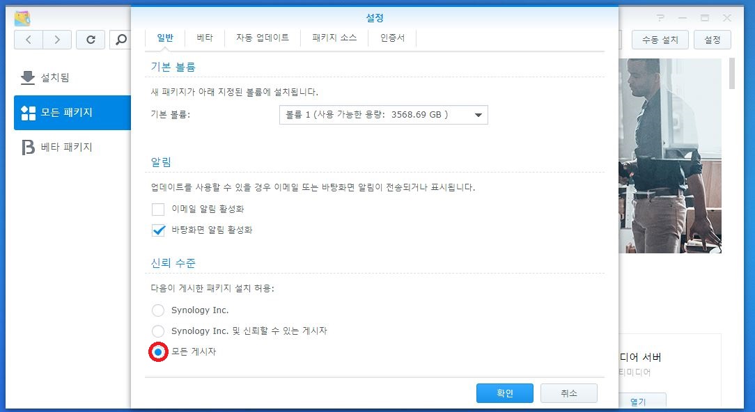 이제 미션을 설치해볼건데요 그전에 패키지센터-설정-신뢰수준 을 모든 게시자로 변경해줍니다.